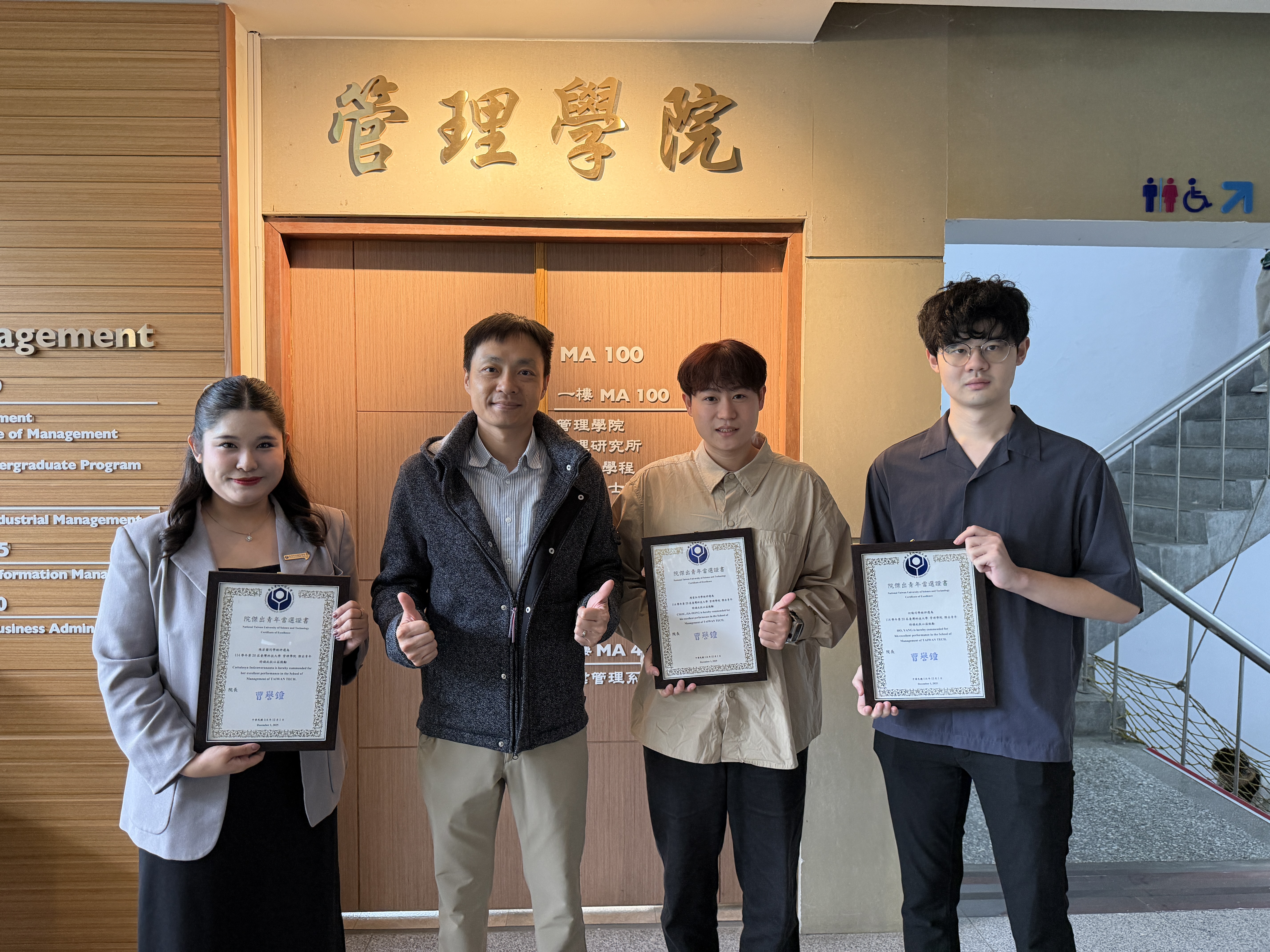 The School of Management Outstanding Youth Selection Committee carefully reviewed the candidates and selected the recipients of the 20th Outstanding Youth Award (2025) as follows: 周家弘 (Department of Industrial Management), Cattaleeya Intiraworanonta (MBA), Chi-Chen Lin (Management Undergraduate Program), and Yang Ho (Management Undergraduate Program) (listed by department). Among them, Cattaleeya (MBA) and Chi-Chen Lin (Management Undergraduate Program) were also selected as Outstanding Youth of National Taiwan University of Science and Technology, receiving special recognition.